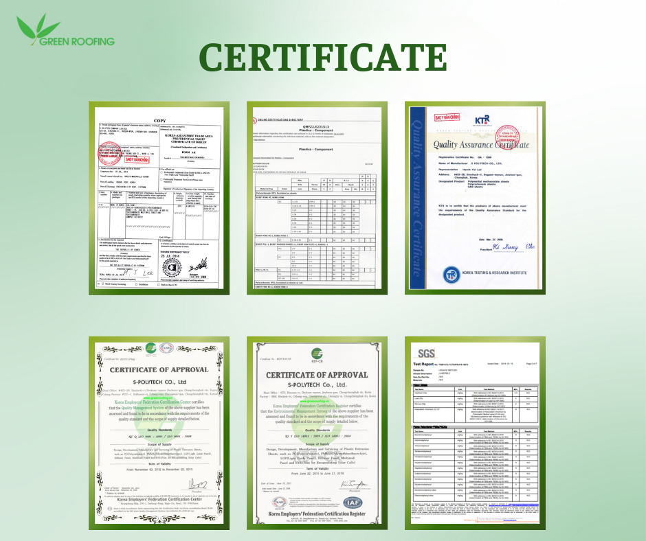 Below are the CO/CQ certificates confirming the product quality from Green Roofing.
