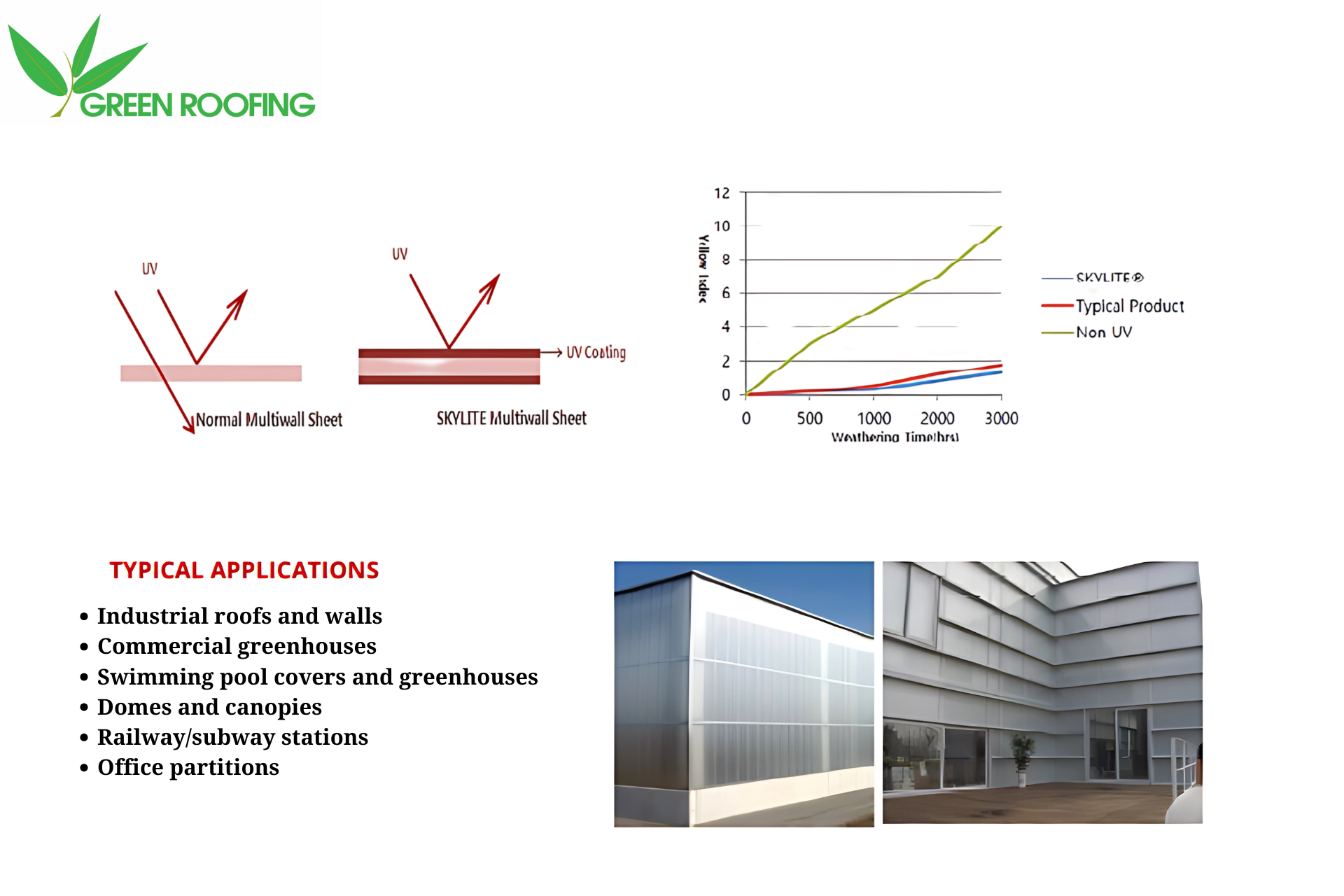 - All colors are always available. SKYLITE sheets come with a single-sided UV protection coating.