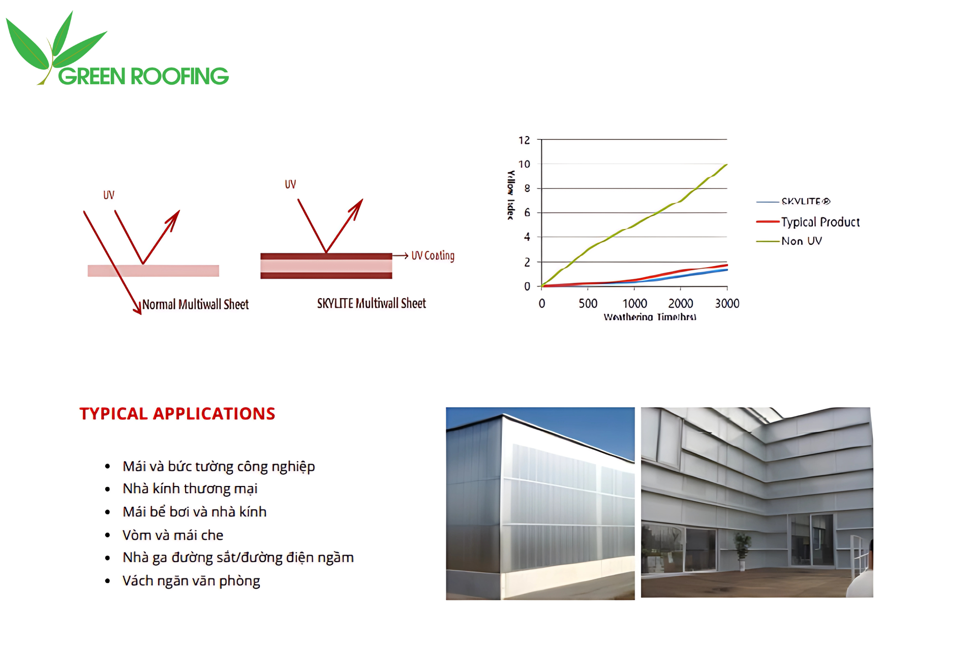Một ví dụ tiêu biểu là tấm Skylite – sản phẩm mang đến giải pháp tối ưu từ Green Roofing. Với cấu trúc bền vững, khả năng chịu va đập cao, và hiệu quả tản sáng vượt trội, Skylite đáp ứng tốt nhu cầu sử dụng trong nhiều lĩnh vực. Tuy nhiên, bên cạnh Skylite, còn nhiều loại tấm polycarbonate rỗng khác với các tính năng và ứng dụng phù hợp cho từng mục đích riêng biệt.